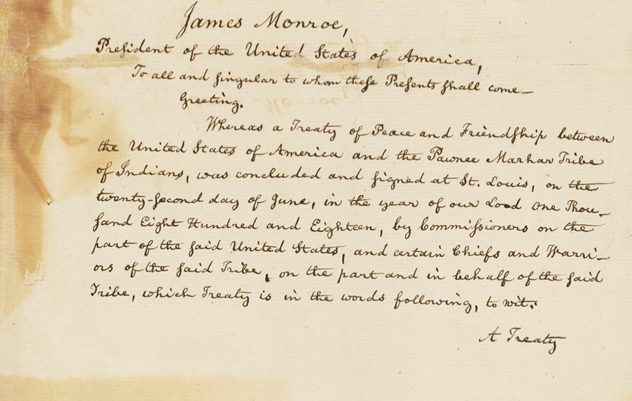 The Treaty with the Pawnee Marhar of 1818 was signed on June 22, 1818 between the U.S. and the Pawnee Marhar tribe. Its purpose was to establish perpetual peace and friendship between the parties. The Pawnee Marhar chiefs acknowledged U.S. protection and no other sovereign power. They agreed to deliver up any individuals who violated the treaty’s terms to be punished under U.S. law. The treaty formally aligned the Pawnee Marhar with the U.S. through renewed peace and regulated relations.