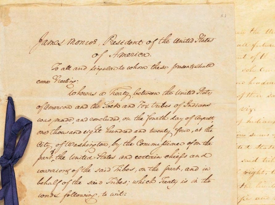 The Treaty with the Sauk and Foxes of 1824 was signed on August 4, 1824 between the U.S. and the Sauk and Fox tribes. Under this treaty, the Sauk and Fox ceded land between the Mississippi and Missouri Rivers in Missouri to the U.S. In exchange, the U.S. agreed to pay them annuities for 10 years and provide a blacksmith, farming supplies and cattle. It established a small reservation for “half-breeds” of the tribes between the Des Moines and Mississippi Rivers. The treaty aimed to remove the tribes from Missouri through land cession in exchange for annuities.